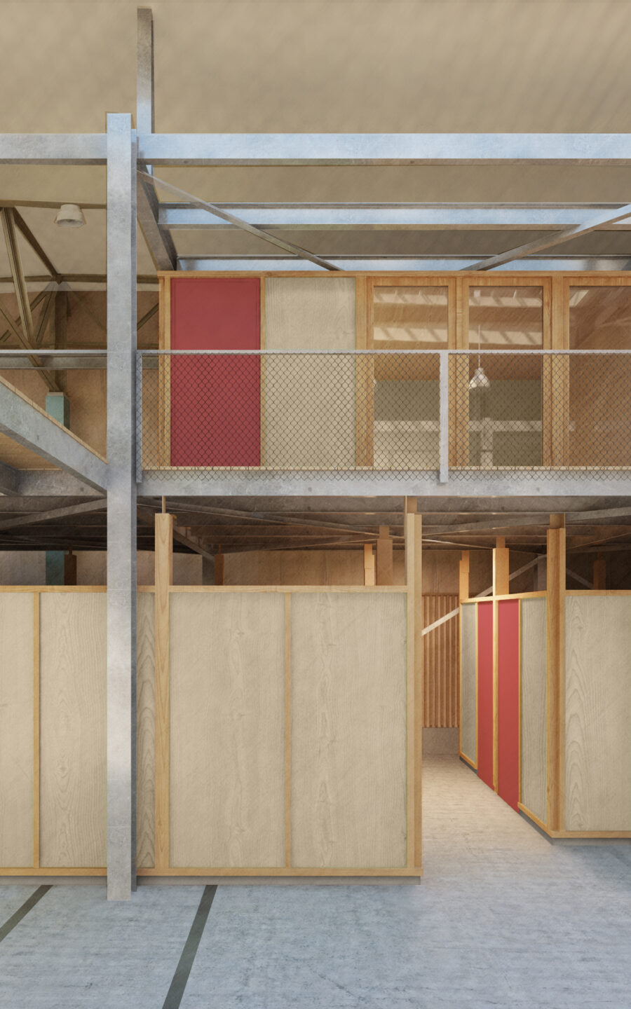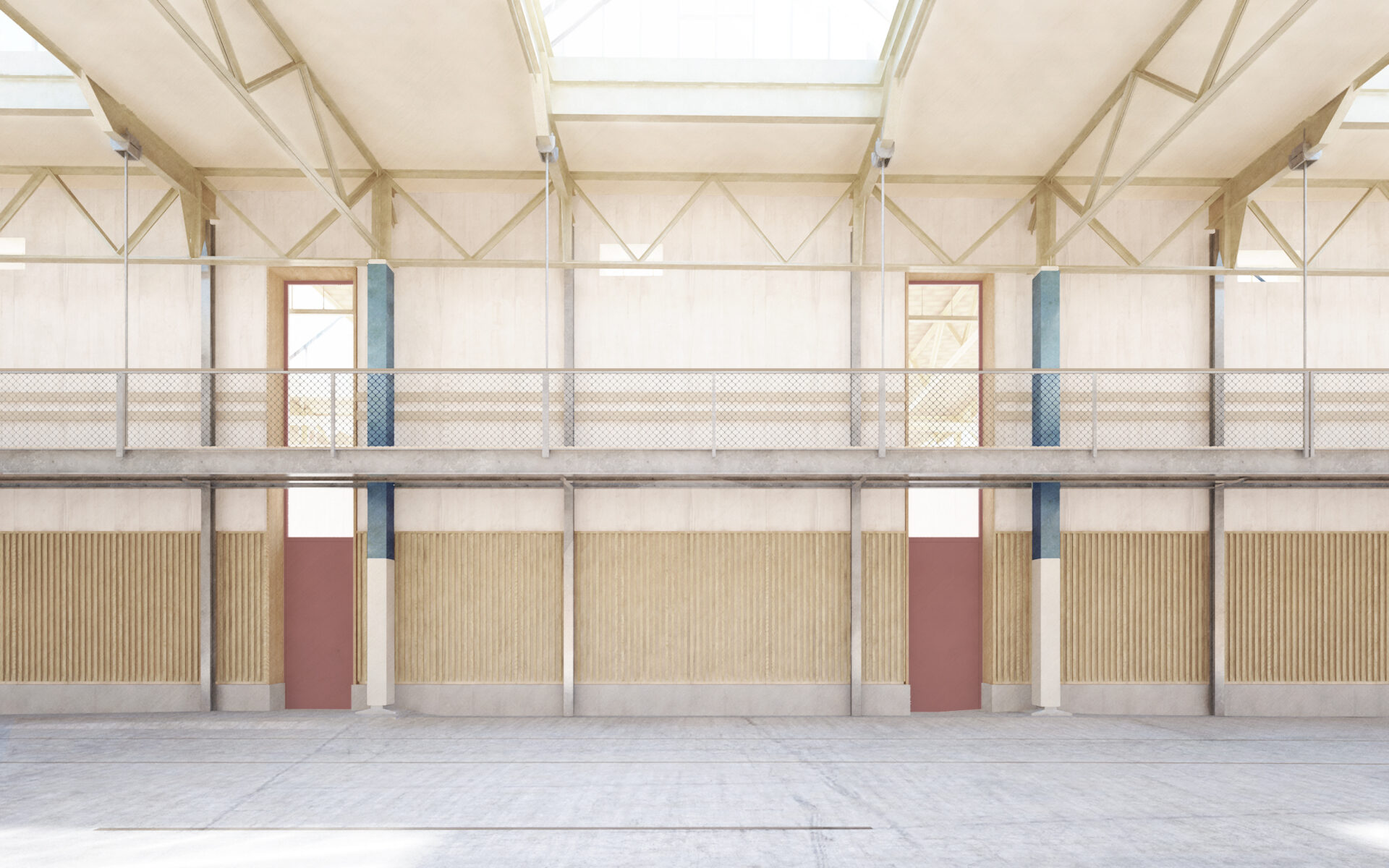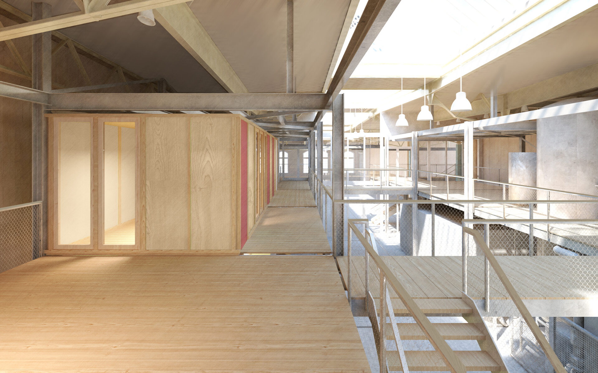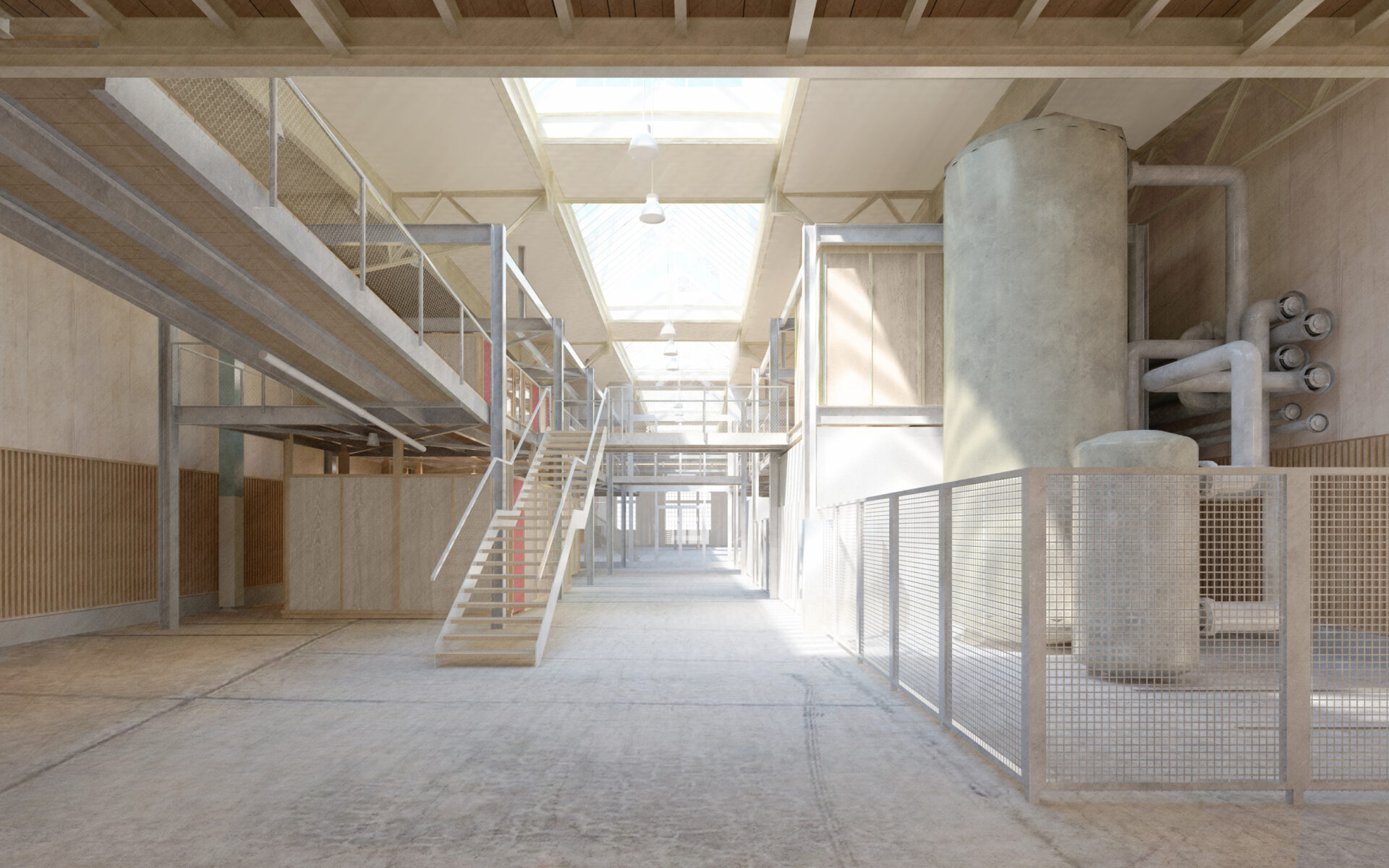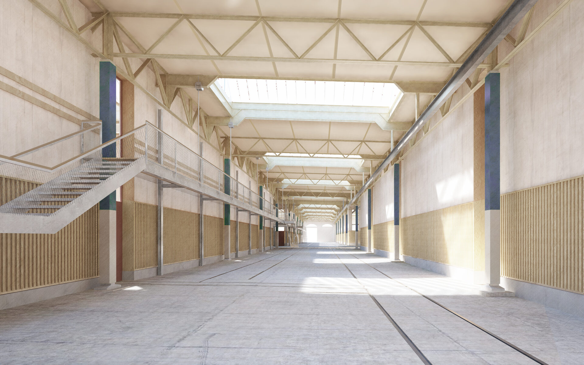 Die vorhandenen räumlichen Eigenschaften des Gebäudes werden grundsätzlich erhalten und so konzipiert, dass das Gebäude in seinen imposanten Abmessungen in allen drei Dimensionen wahrnehmbar bleibt. Mit dem Grundausbau wird die Halle neu organisiert und in vier Quadranten sowie eine offene, in der Mitte liegende Energiezentrale aufgeteilt. Zur Ausbildung dieses dreigeschossigen Herzstücks, der angrenzenden 100 Meter langen Galerie und der Zwischenböden innerhalb der Quadranten kommen ausgediente SBB-Fahrleitungsmasten als Stahlgerüst zum Einsatz. Ein Beispiel für die Wiederverwertung von Materialien im Sinne der Kreislaufwirtschaft. Auch andere Bauteile wie Stahltreppen, Gitterroste, Balken, Holzverschnitt oder Leuchten werden aufbereitet und weiterverwendet. Die baulichen Eingriffe berücksichtigen die Qualitäten des Bestandes und machen sie fit für eine auf lange Sicht flexible Nutzung. So entsteht eine zukunftsweisende Koexistenz von Alt und Neu.